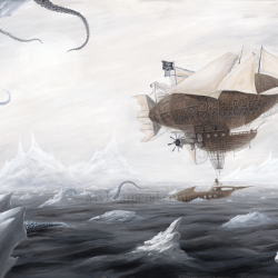 The original painting was commissioned for Robert Brown of Abney Park, and it includes the airship HMS Ophelia as well as a Jules Vernian submarine, and some Lovecraftian influences.