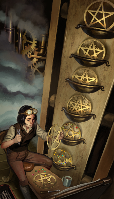 The 8 of Pentacles has always been a special card to me. It indicates a quest for mastery, a journey of doing things over and over in order to find ways to improve either quality or efficiency. I also like how this image ties in with the DYI sensibility of the Steampunk Community, as well as the archetype of the inventor and craftsperson, always seeking perfection.